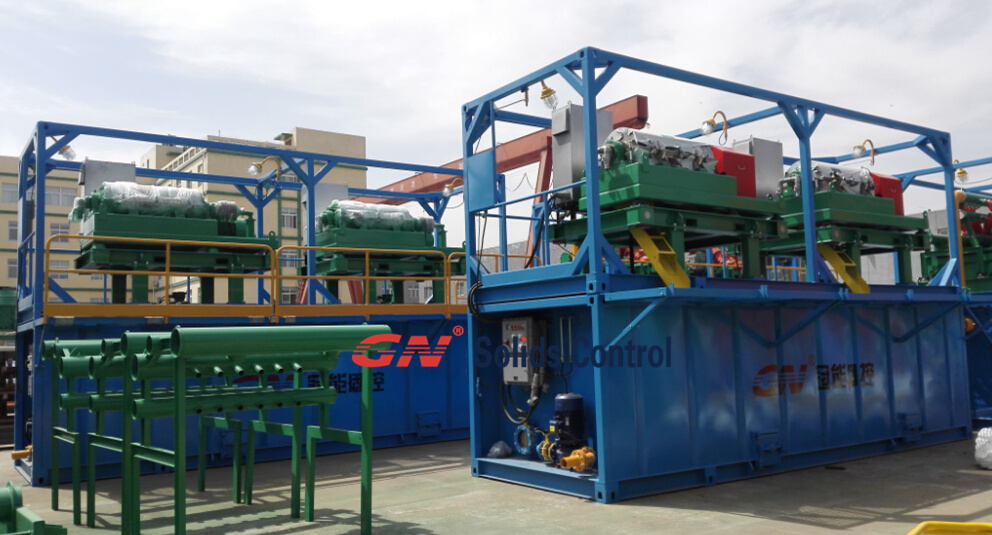 3 臺GNZS594J-2S12N泥漿清潔器。 冠能的除砂除泥一體機是由兩個十英寸的除砂旋流器、十二個四英寸的除泥旋流器和一臺GNZS594底流篩組成。這款泥漿清潔器的工作性能比不配備底流篩的單獨除砂器、除泥器處理效果好。